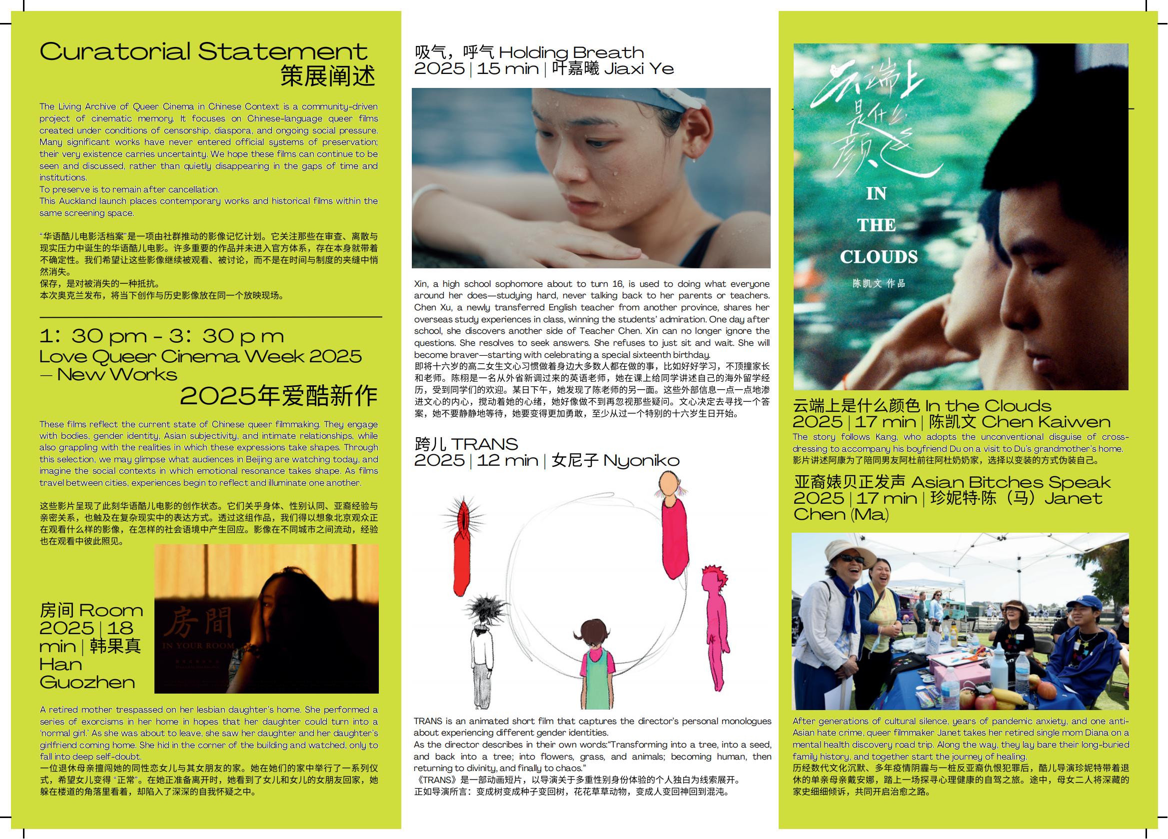 这些影片呈现了此刻华语酷儿电影的创作状态。它们关乎身体、性别认同、亚裔经验与亲密关系,也触及在复杂现实中的表达方式。透过这组作品,我们得以想象北京观众正在观看什么样的影像,在怎样的社会语境中产生回应。影像在不同城市之间流动,经验也在观看中彼此照见。