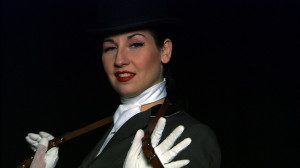 A coquettish stripper flirts with an upper-class lady. A dressage rider jumps into a quasi-pornographic ménage à trois with two women playing a horse. A disc adorned with a spiral and a throwing knife rotatesin a sea of confetti. And a silent, laughing, cheering and kissing lesbian-queer choir surround the trilogy. In the context of post-porn strategies and the neo-burlesque movement, captured (also) by queers and feminists for whom the plurality and performativity of body images and forms of desire are central, the Vienna-based artist Katrina Daschner crosses the heterosexist gaze with an obvious, classical vocabulary of temptation. When the burlesque performer in the first part “Hafenperlen (Harbor Pearls)” smilingly calls up the traditional gestures of an erotic tease, thereby referencing an Egyptian film of the 1940s in which the singer and dancer Naima Akef embodies both the belly dancer as well as the captain flirting with her, her smile is no longer that of an available object. On the contrary, the knowing grin, directly addressed to the camera, together with the complicit winking between the stripper and the observing lady (both played by Daschner), creates a distance from the glamorous and stylish, almost sterile staging of the events, at the same time commenting on the fantasm, as well as the liberating laughter of the lesbian chorus at the end. Also in the second and third parts, “Aria de Mustang” and “Flaming Flamingos,” which allude to recurring motifs in film and theater history with calculated dramatical effects and queer musical undertones by the Kumbia Queers, Bonanza Jellybean and Edita Gruberová, the sensuous self-determination stands at the core, which through the plurality of the chorus, appearing at times androgynous, at times opulent in red drag, comments with a wink of the eye, before finally embedding in a powerful collective.